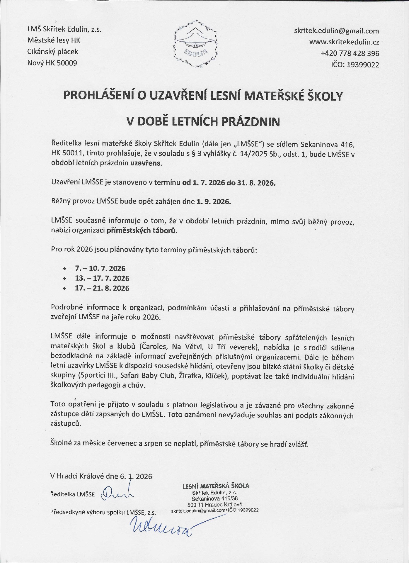 Ředitelka LMŠ Skřítek Edulín vydává prohlášení o uzavírce školky během letních prázdnin.⛱️☀️💦